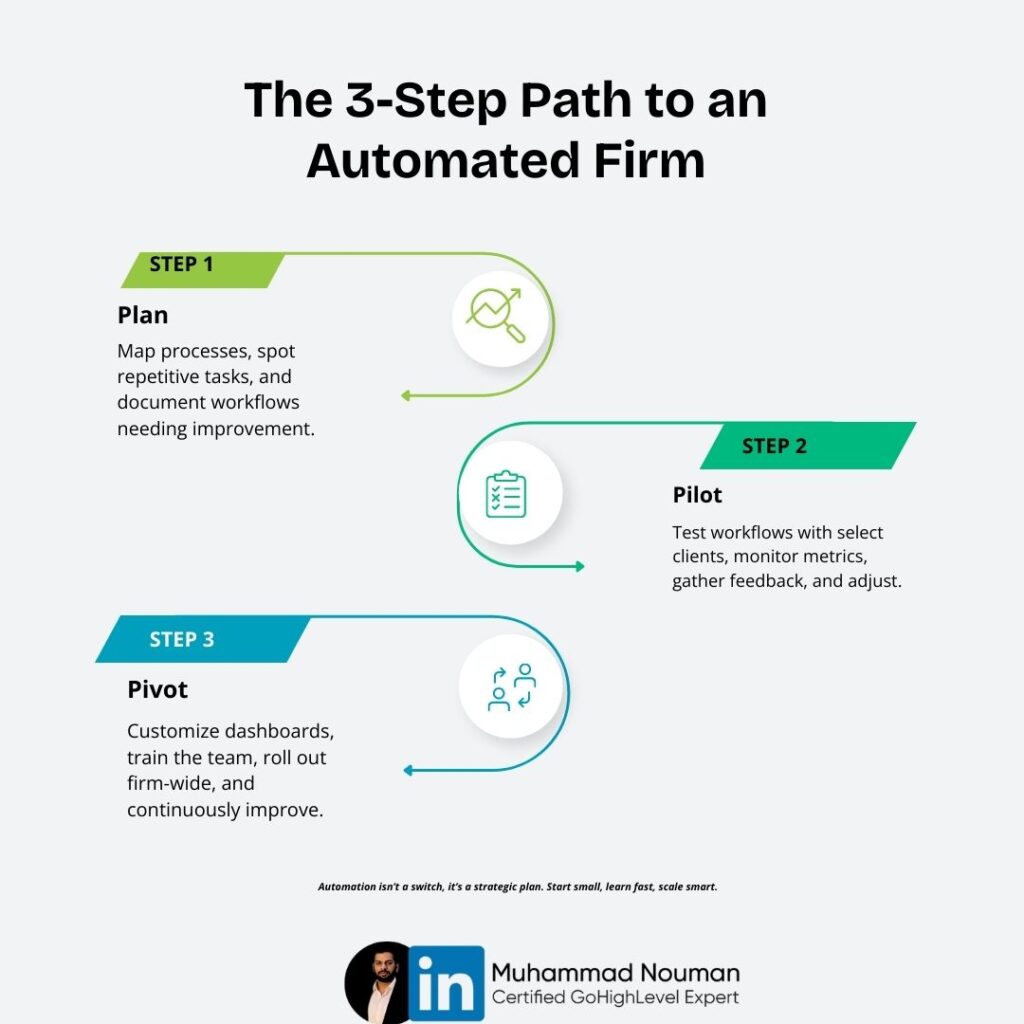 Firms that win follow this path. First, plan by mapping processes. Identify clear automation spots. Find repetitive tasks. Document workflows that need work.