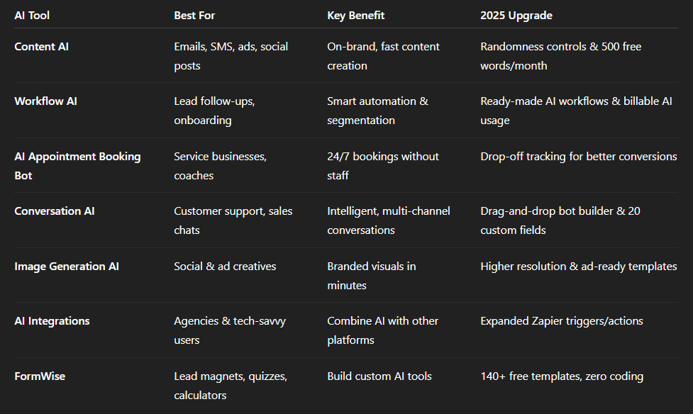 GoHighLevel AI Tools Overview (Quick Comparison)