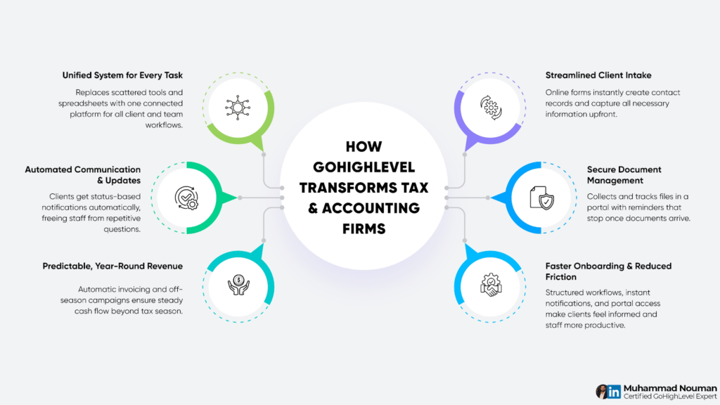 GoHighLevel is not just a CRM. In fact, when built correctly, it becomes the operating system of your entire tax firm. It handles onboarding, document collection, communication, signatures, payments, and client re-engagement, all without manual effort.
