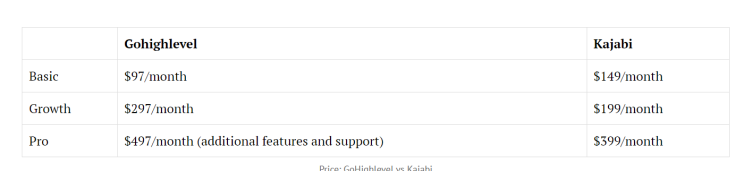 - Pricing Structure: GoHighLevel uses a flexible pricing model based on usage, starting at 97 dollars per month and going up to 497 dollars for agency-level features. Kajabi uses fixed pricing tiers, starting at 149 dollars per month for the Basic plan, 199 dollars for the Growth plan, and 399 dollars for the Pro plan.
