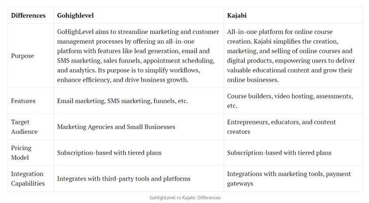 - Purpose and Audience: GoHighLevel is built mainly for agencies and service-based businesses that need tools for managing clients, automating sales, and generating leads. Kajabi, on the other hand, is designed for creators, coaches, and educators who want to build and sell digital products like online courses and membership programs.
