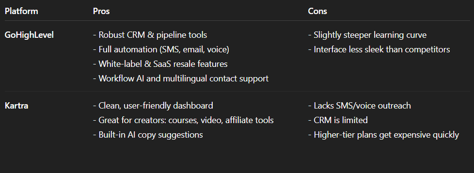 Pros & Cons: GoHighLevel vs Kartra (2025)