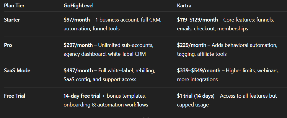 When it comes to choosing between GoHighLevel and Kartra, pricing can be a deciding factor, especially for agencies, freelancers, and creators looking to scale. Both platforms offer powerful features, but their pricing models cater to different audiences. GoHighLevel leans toward client-focused businesses and SaaS resellers, while Kartra aims to serve content creators and info-product sellers.