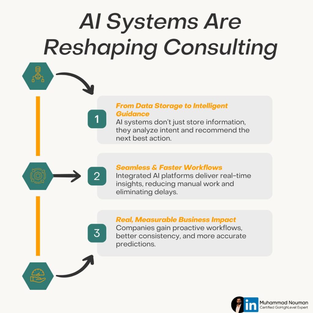 Companies using integrated AI systems like GoHighLevel see tangible change. First, outdated workflows become proactive. Additionally, consistency improves, and predictions become more accurate. Therefore, performance is measurable, and the future of consulting infrastructure drives real transformation.